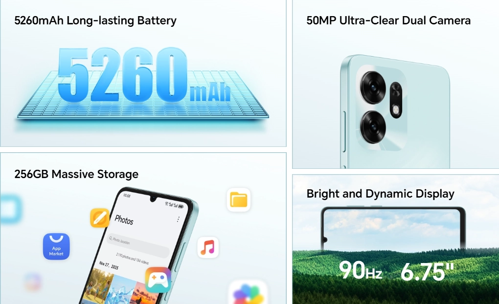 ফোনটিতে থাকবে 5260mAh ব্যাটারি এবং 15W কুইক চার্জিং, যা বাজেট‑ফ্রেন্ডলি ব্যবহারকারীদের জন্য সন্তোষজনক হবে। এছাড়া সিকিউরিটির জন্য ফোনটিতে সাইড-মাউন্টেড ফিঙ্গারপ্রিন্ট সেন্সর এবং ফেস আইডি ব্যবহার করা হবে।