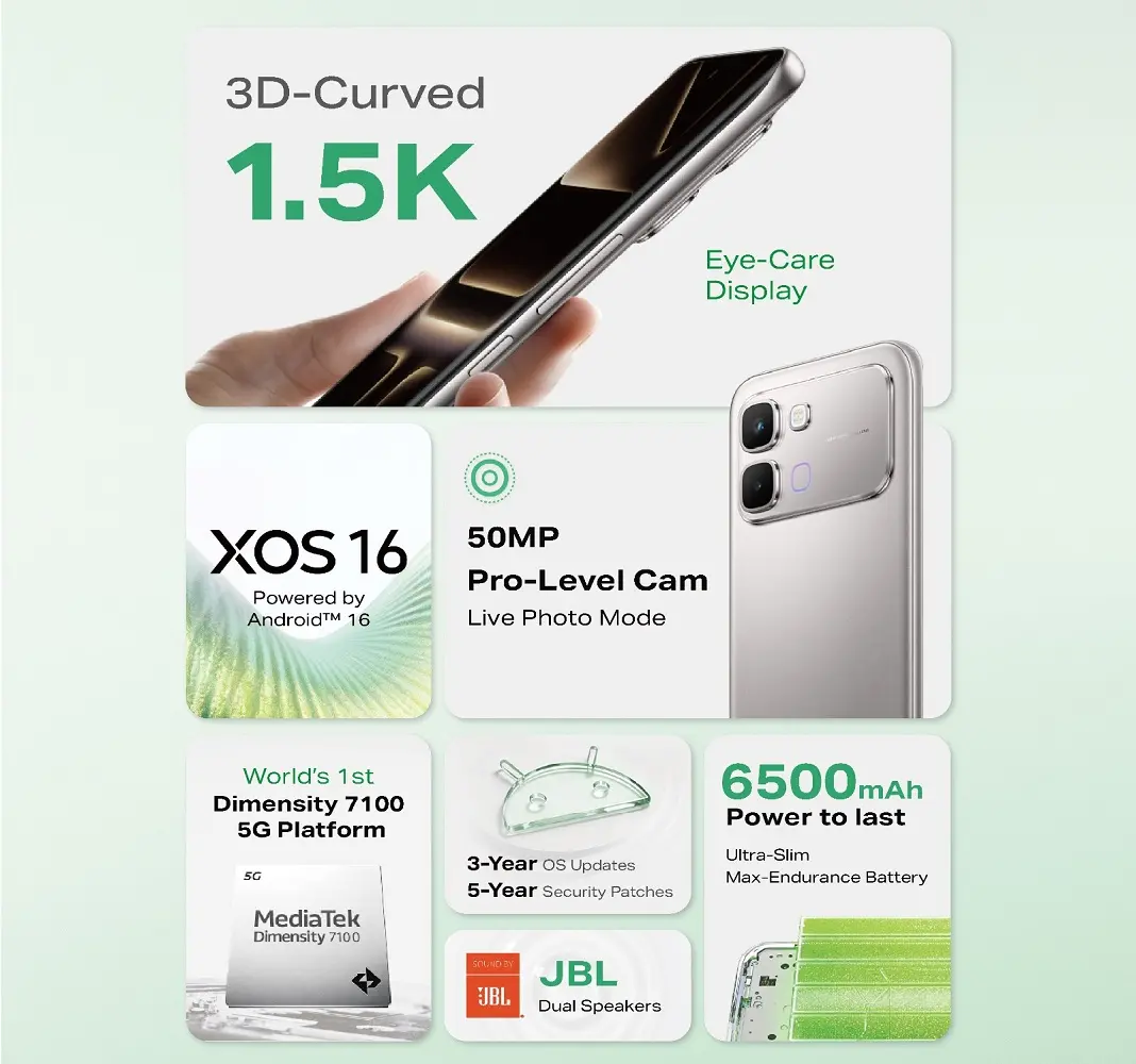 নতুন মডেলের Infinix Note Edge 5G স্মার্টফোনে MediaTek Dimensity 7100 প্রসেসর ব্যবহার করা হবে, যা দৈনন্দিন কাজ এবং হালকা‑মাঝারি গেম খেলার সময় ভালো পারফরম্যান্স প্রদান করবে। এছাড়া ফোনটিতে থাকবে 144Hz রিফ্রেশ রেট সমর্থিত 3D Curved AMOLED ডিসপ্লে। চলুন এবার জেনে নেওয়া যাক ফোনটির গুরুত্বপূর্ণ স্পেসিফিকেশন ও দাম।