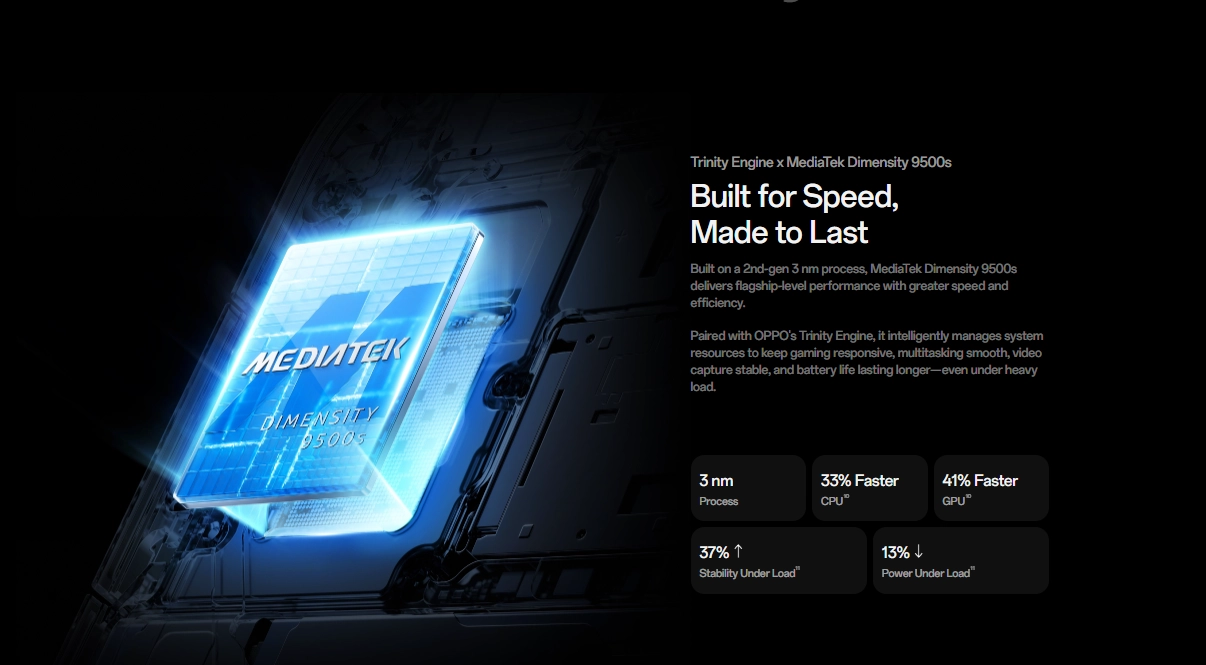 Oppo Find X9s স্মার্টফোনে রয়েছে 3 ন্যানোমিটার ফেব্রিকশনে তৈরি MediaTek Dimensity 9500s প্রসেসর, যা সর্বোচ্চ 3.73 GHz ক্লক স্পীডে কাজ করে, ফলে হাই গ্রাফিক্স গেম, ভারী অ্যাপ, ভিডিও এডিট এবং মাল্টিটাস্কিং করার সময় দ্রুত ও স্মুথ পারফরম্যান্স পাওয়া যায়। এছাড়া ফোনটি ColorOS 16.0 ভিত্তিক Android 16 অপারেটিং সিস্টেমে চলে।