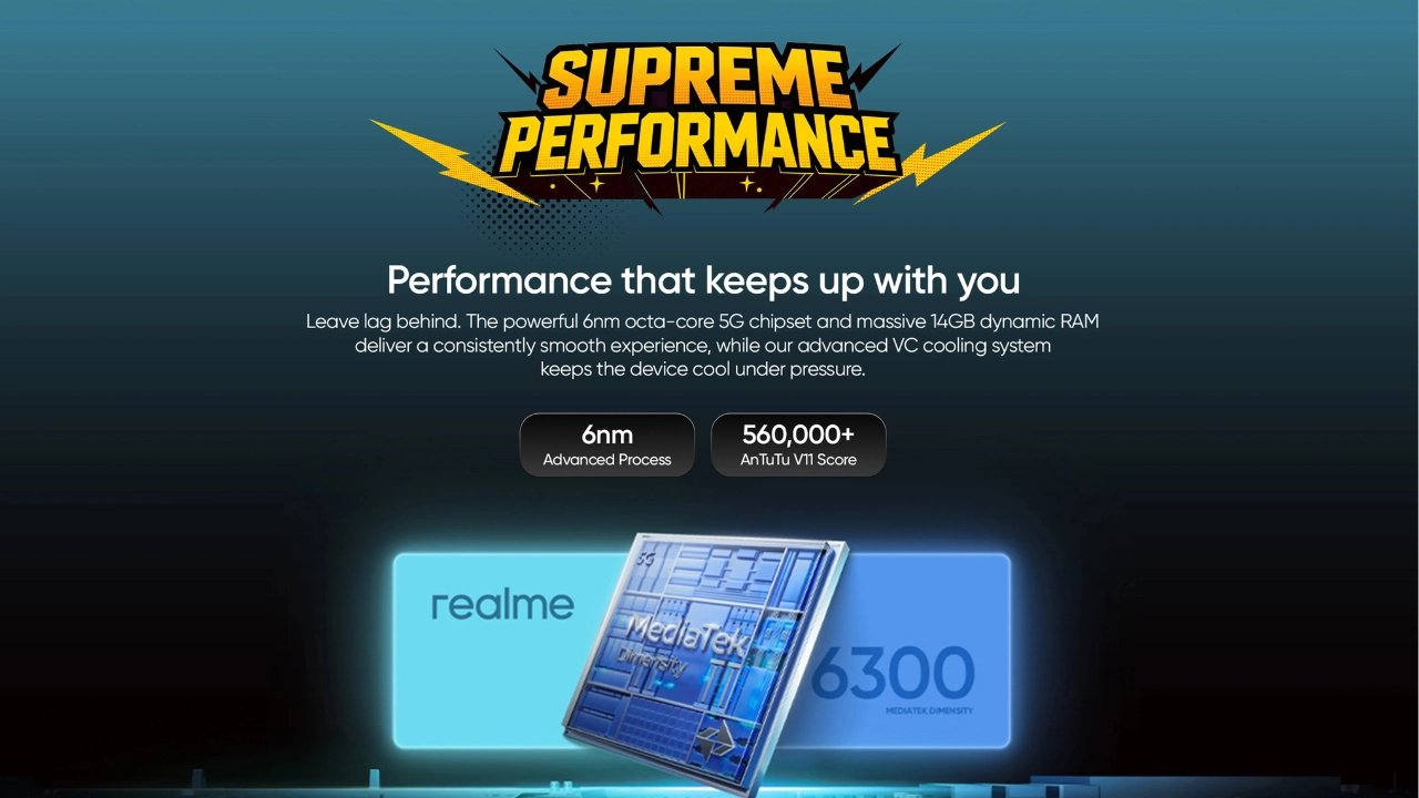 দ্রুত ও স্মুথ পারফরম্যান্স ফোনটিতে MediaTek Dimensity 6300 প্রসেসর দেওয়া হবে। 6 ন্যানোমিটার প্রযুক্তিতে তৈরি এই চিপসের ক্লক স্পীড 2.0GHz থেকে 2.4GHz পর্যন্ত। পাশাপাশি যুক্ত করা হবে 5300mm² VC ফিচার, যার সাহায্যে দীর্ঘ সময় গেম খেলা বা ভারী অ্যাপ ব্যবহারের সময় ফোন গরম কম হবে এবং পারফরম্যান্স স্থিতিশীল থাকবে। ফোনটি Realme UI ভিত্তিক Android 16 অপারেটিং সিস্টেমে চলবে।