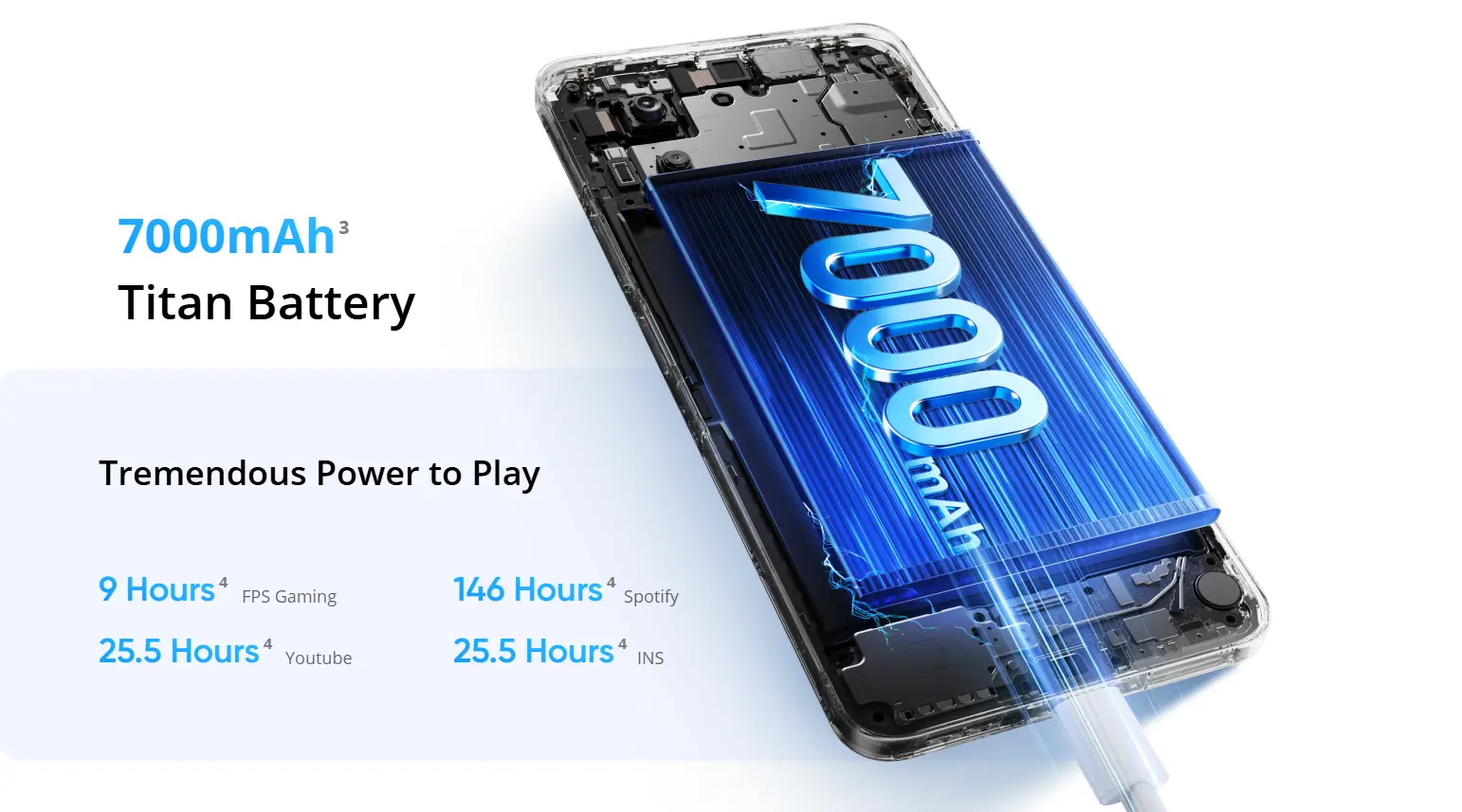 দীর্ঘ সময় ব্যবহারের সুবিধা নিশ্চিতের জন্য ফোনটিতে 7000mAh ব্যাটারি দেওয়া হবে এবং দ্রুত চার্জ করার জন্য এই ফোনে থাকবে 45W ফাস্ট চার্জিং। ফোনটিতে IP64 রেটিং সাপোর্ট করে, যা ধুলোবালি ও পানির ছিটা প্রতিরোধ করতে সক্ষম। ফোনটি Realme UI 6.0 নির্ভর Android 15 অপারেটিং সিস্টেমে চলবে।
