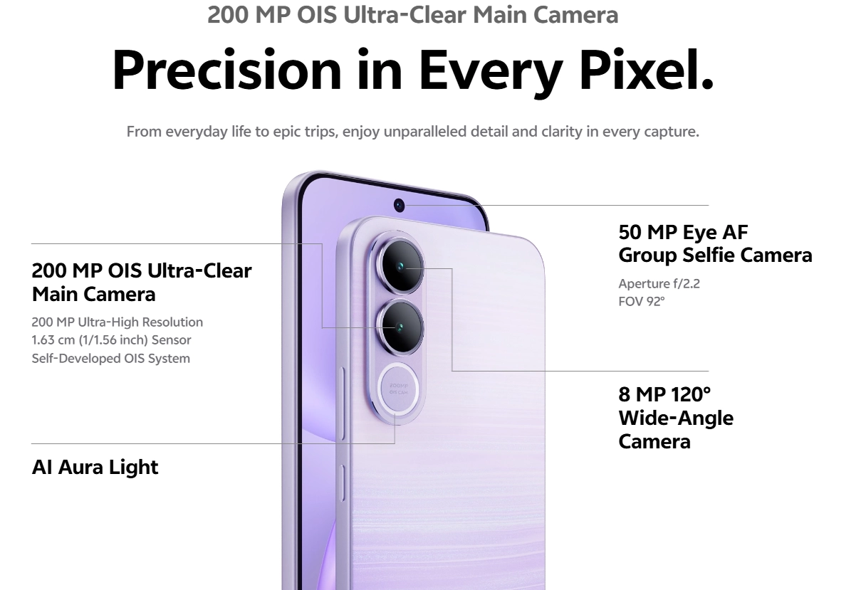 Vivo V70 FE 5G স্মার্টফোনে 200MP OIS রেয়ার ক্যামেরা ব্যবহার করা হবে, যার মাধ্যমে ফটোগ্রাফাররা খুবই পরিষ্কার ও ডিটেইলসমৃদ্ধ ছবি তুলতে পারবেন। পাশাপাশি, OIS ফিচারের কারণে কাঁপাহীন ও মসৃণভাবে ভিডিও ধারণ করতে পারবেন, ফলে ভিডিও হবে আরও প্রফেশনাল মানের।