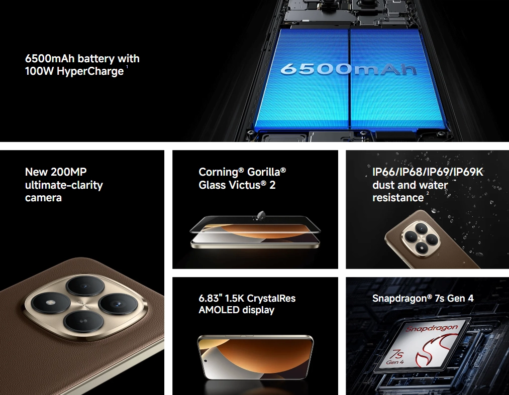 Xiaomi Redmi Note 15 Pro Plus 5G স্মার্টফোনে রয়েছে IP68/IP69K রেটিং, যা ধুলোবালি, ভারী বৃষ্টি, উচ্চ চাপের পানি এবং গরম পানি থেকে ফোনকে রক্ষা করে। এছাড়া দ্রুত ও স্মুথ পারফরম্যান্সের জন্য ফোনটিতে Snapdragon 7s Gen 4 প্রসেসর ব্যবহার করা হয়েছে। 4 ন্যানোমিটার ফেব্রিকশনে তৈরি এই চিপসের ক্লক স্পীড 2.7GHz পর্যন্ত।